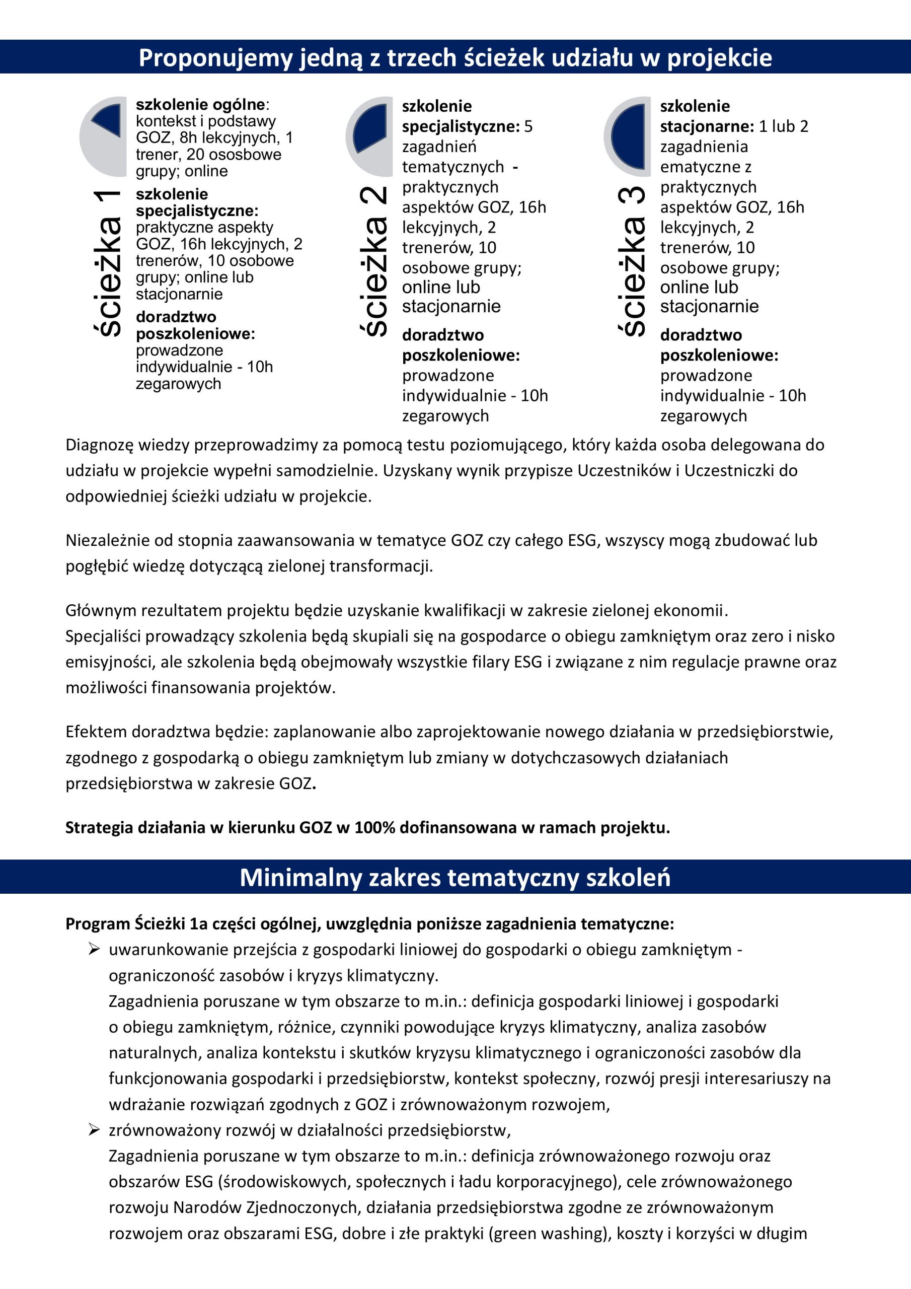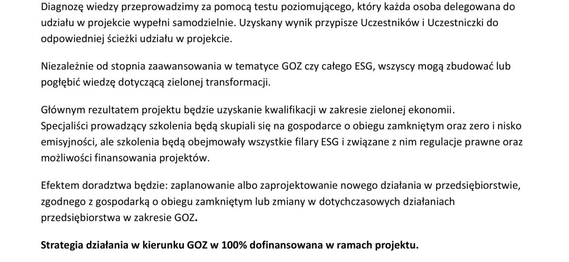 Projekt skierowany jest do firm, które chcą rozwijać się w duchu Gospodarki o Obiegu Zamkniętym (GOZ) – jednego z trzech kluczowych filarów ESG, mającego istotny wpływ na poprawę wyników w raportowaniu pozafinansowym.