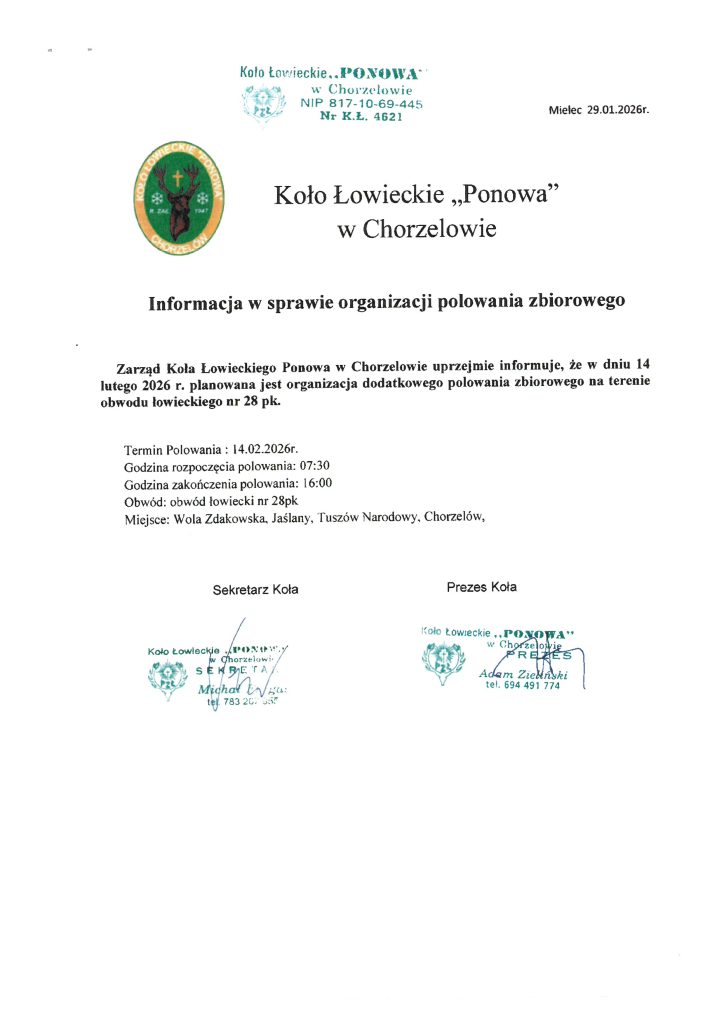 Zarząd Koła Łowieckiego “Ponowa” w Chorzelowie informuje o dodatkowym polowaniu zbiorowym swojego koła w dniu 14 lutego 2026r. na terenie obwodu łowieckiego nr 28 pk. Szczegóły w załączniku.