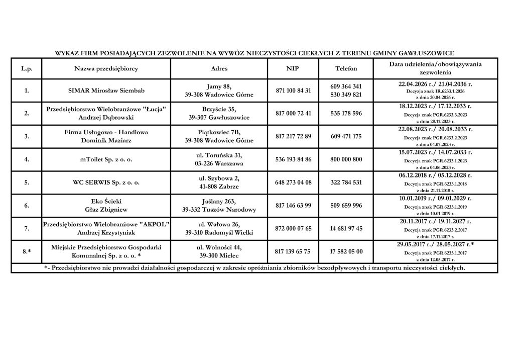 REJESTR DZIAŁALNOŚCI REGULOWANEJ GMINA GAWŁUSZOWICE na dzień 15.01.2025r.