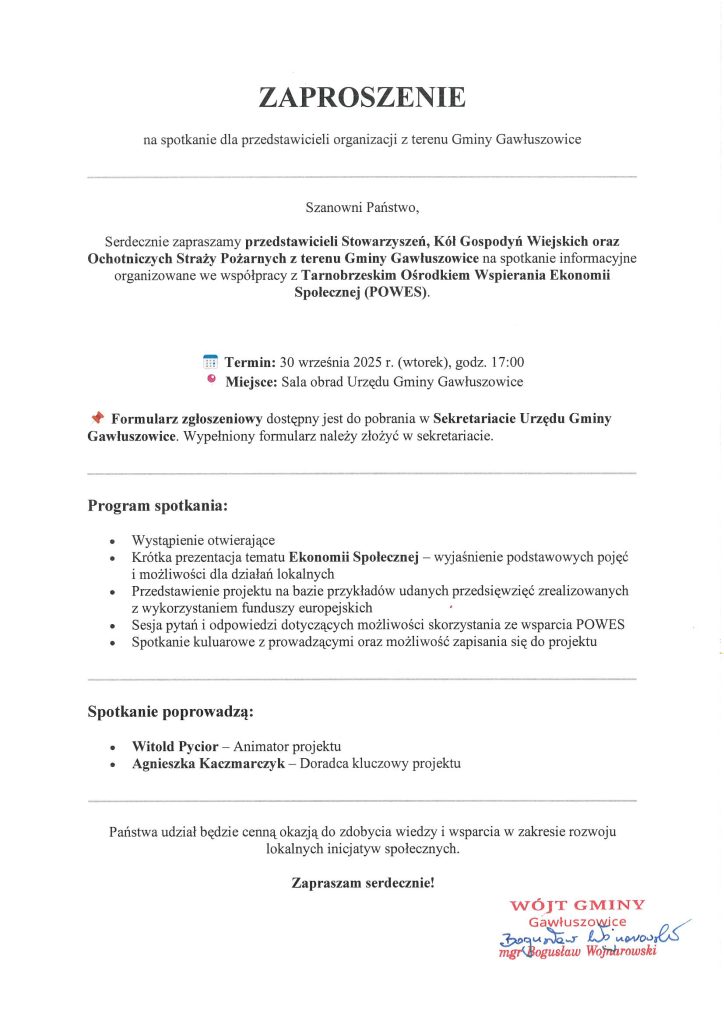 Serdecznie zapraszamy przedstawicieli Stowarzyszeń, Kół Gospodyń Wiejskich oraz Ochotniczych Straży Pożarnych z terenu Gminy Gawłuszowice na spotkanie informacyjne organizowane we współpracy z Tarnobrzeskim Ośrodkiem Wspierania Ekonomii Społecznej (POWES).