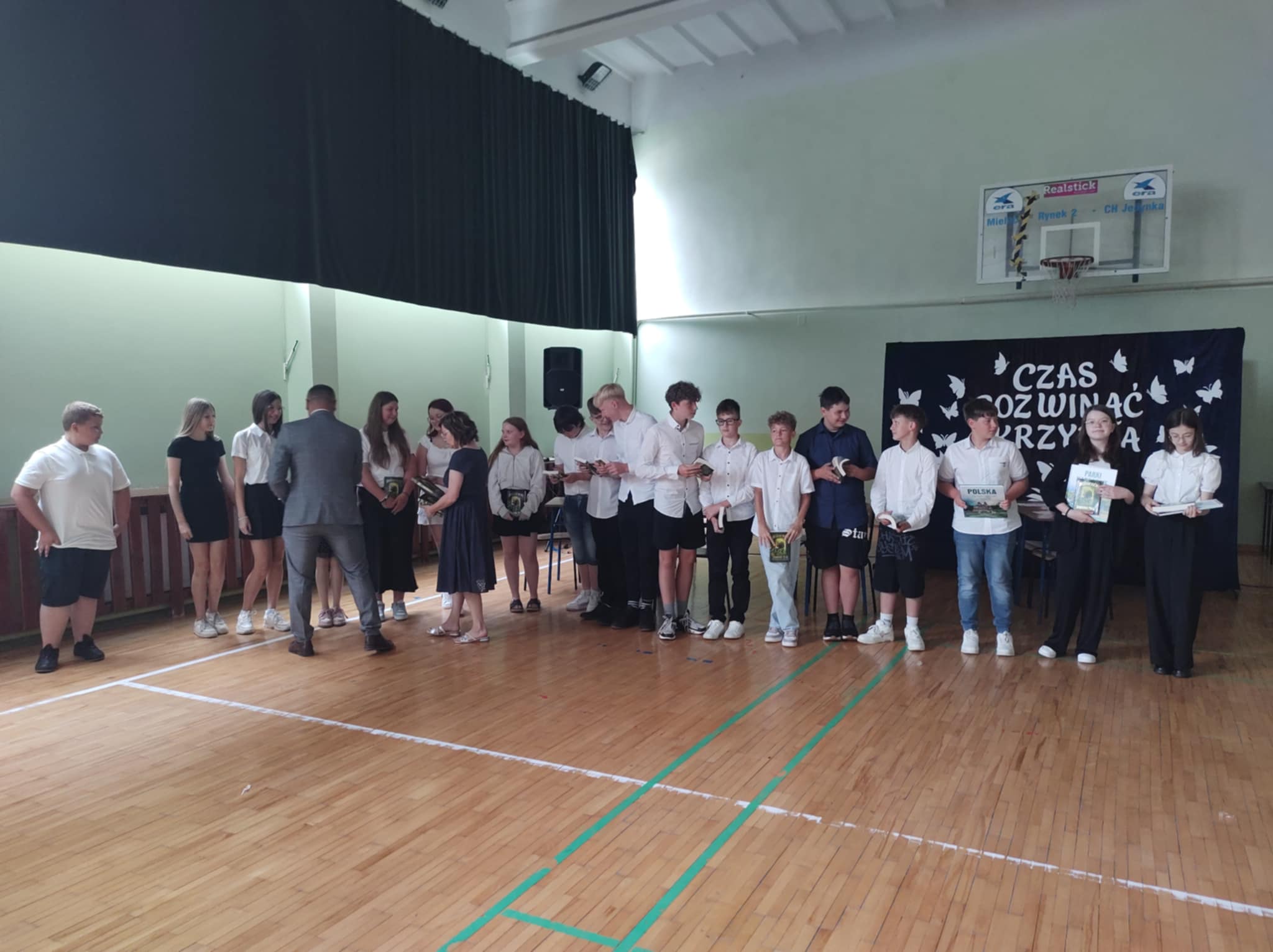 Szczególne słowa uznania skierował do ósmoklasistów, życząc im powodzenia w dalszej drodze edukacyjnej. Na pamiątkę ukończenia szkoły otrzymali oni upominki.