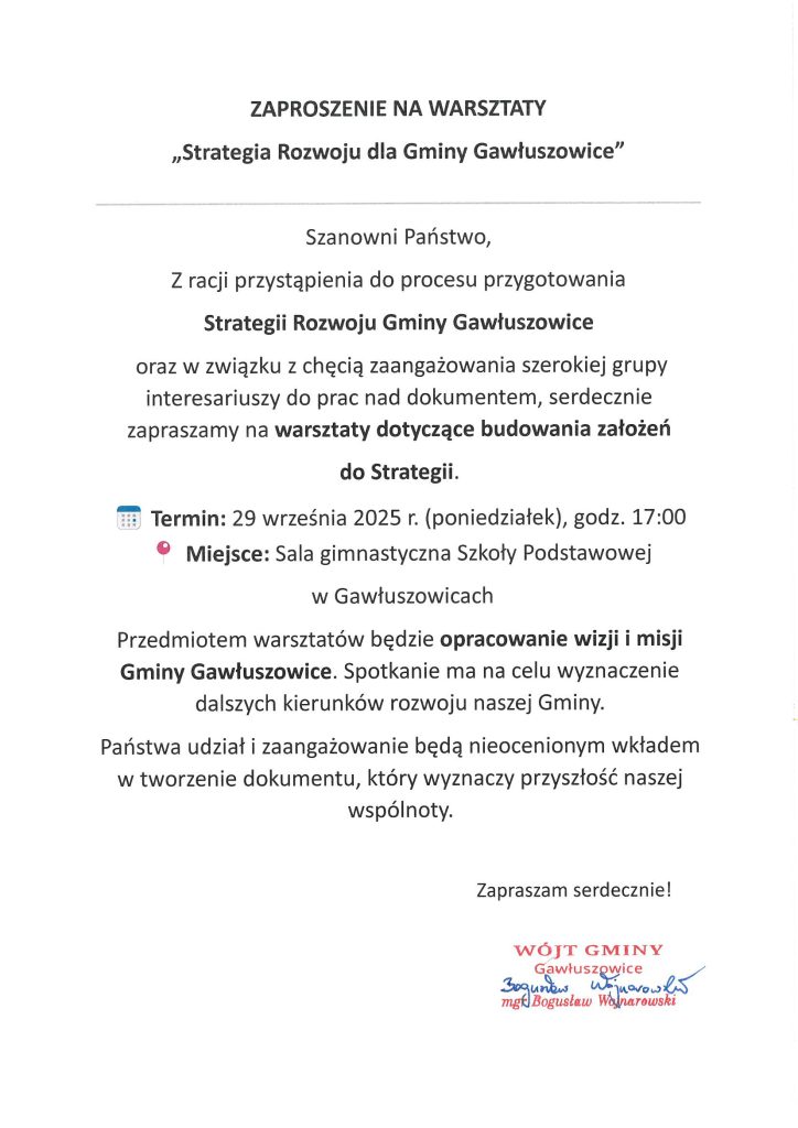 Zaproszenie na warsztaty "Strategia Rozwoju dla Gminy Gawłuszowice"