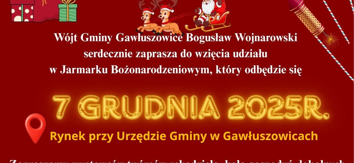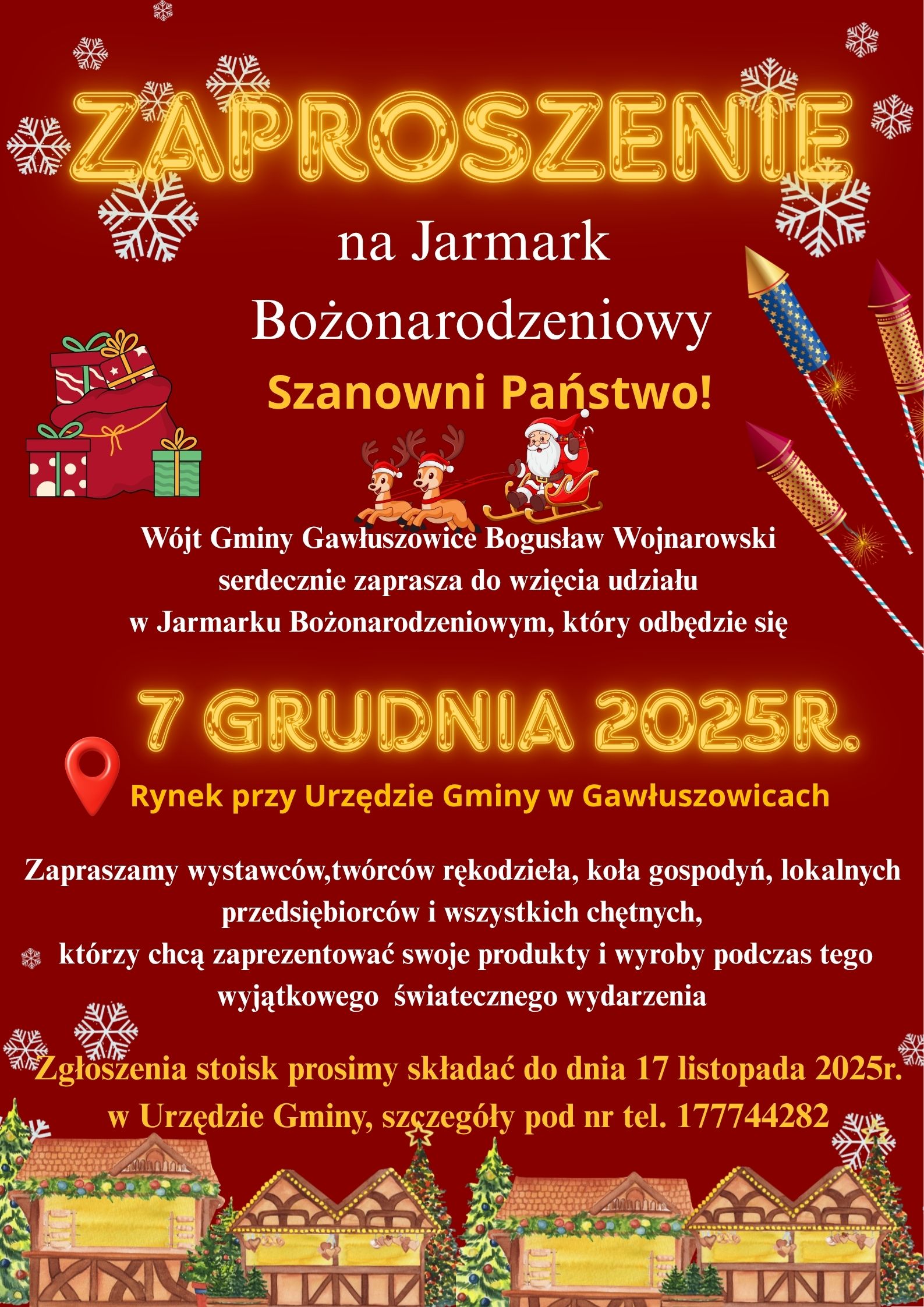Informacje Zostań wystawcą Jarmarku Bożonarodzeniowego 2025 w Gawłuszowicach! 10/10/2025 at 10:00 7 grudnia 2025 r. Rynek obok Urzędu Gminy. Masz wyjątkowe produkty, rękodzieło, świąteczne smakołyki czy ozdoby? Nie czekaj – zgłoś się! Zgłoszenia przyjmujemy w Urzędzie Gminy Gawłuszowice. Razem stwórzmy magiczną, świąteczną atmosferę!